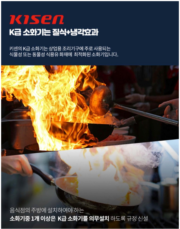 Kitchen(키친)의 K를 따와서 K급 소화기라고 합니다. 음식점 주방에 설치해야 하는 소화기 중에 1개 이상은 K급 소화기를 의무설치하도록 규정이 신설됐습니다.